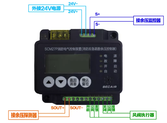 1.将连接余压探测器的无极性二总线接入27P的"SOUT+"、"SOUT-"端;