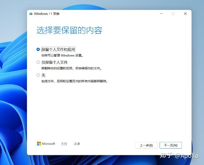 经过几分钟的等待,最终系统安装程序会出现这种提示,让用户选择是否保留已有文件和应用,如果选择不保留,后续系统安装过程中,会彻底删除现有系统中的所有文件和应用。