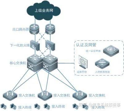 考虑到外网对于网络安全防护需求,综合对内及对外考虑设置出口网关、防火墙、统一认证系统及网络管理系统等,考虑设备兼容性及售后服务,采用与核心交换机同一品牌。