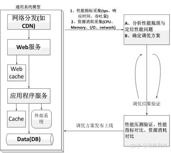 性能测试除了为获取性能指标外,更多是为了发现性能瓶颈和性能问题,然后对性能问题和瓶颈进行分析和调优,在当今互联网高速发展的时代,性能调优的模型可以归纳总结如下图所示。